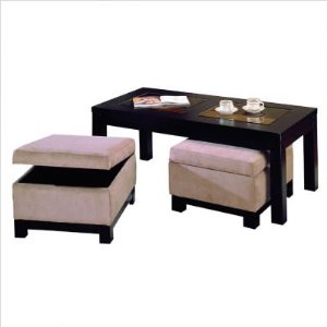 will fit your needs. It is a three-piece set and yet it maximized space that the two ottomans fits under the coffee table. The two storage ottomans slide easily under the hardwood glass-top coffee table. Under the micro-fiber cushions are storage options for your books, games, etc.